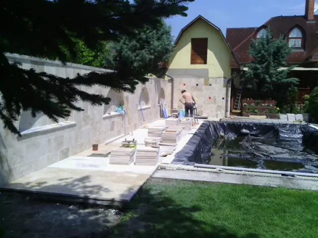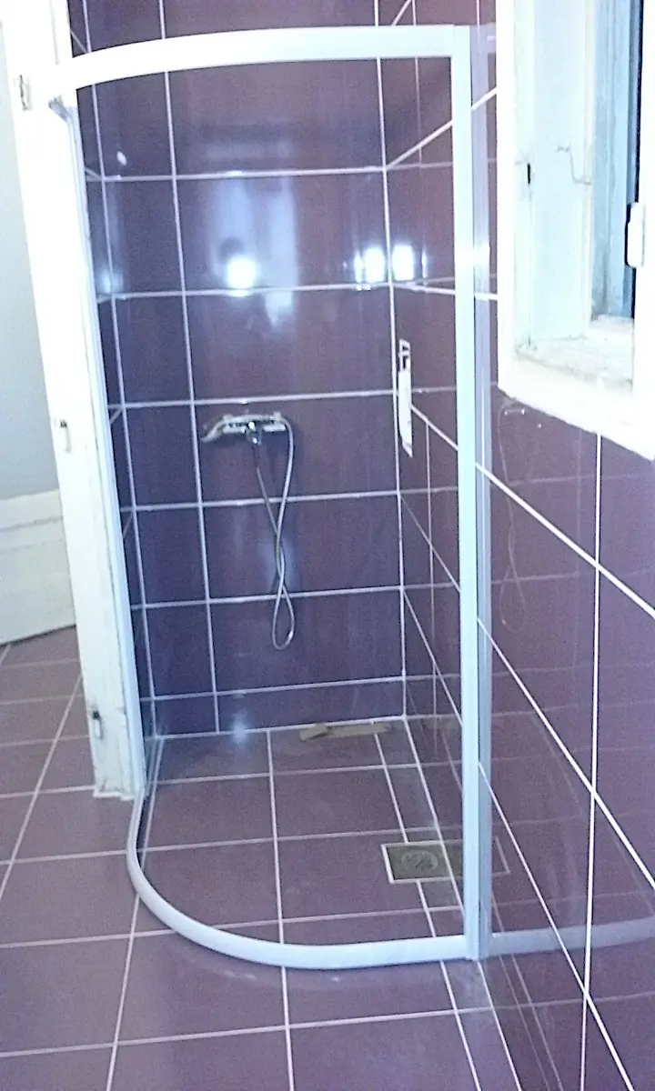 Kőburkolás zuhanykabin beszereléssel együtt, bevésett tusfürdő tartóval.