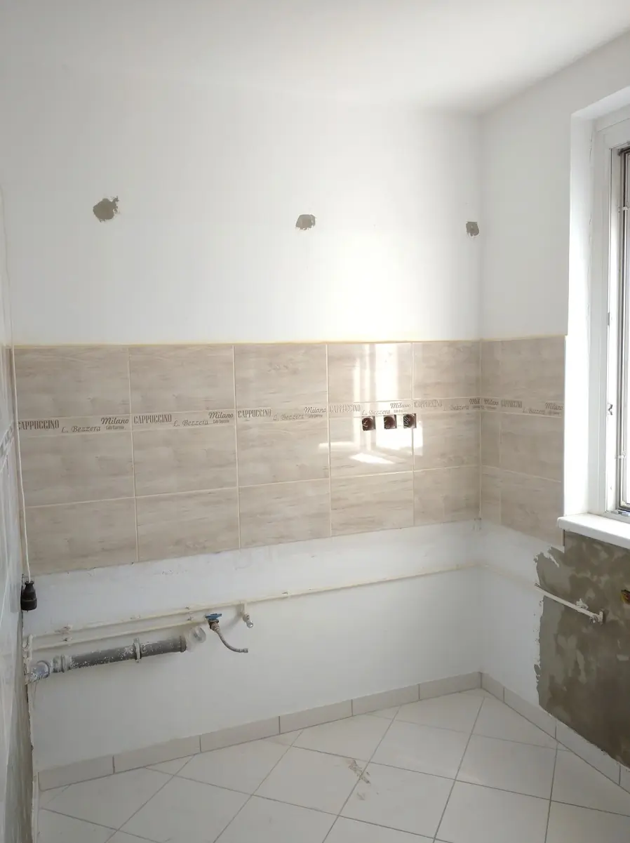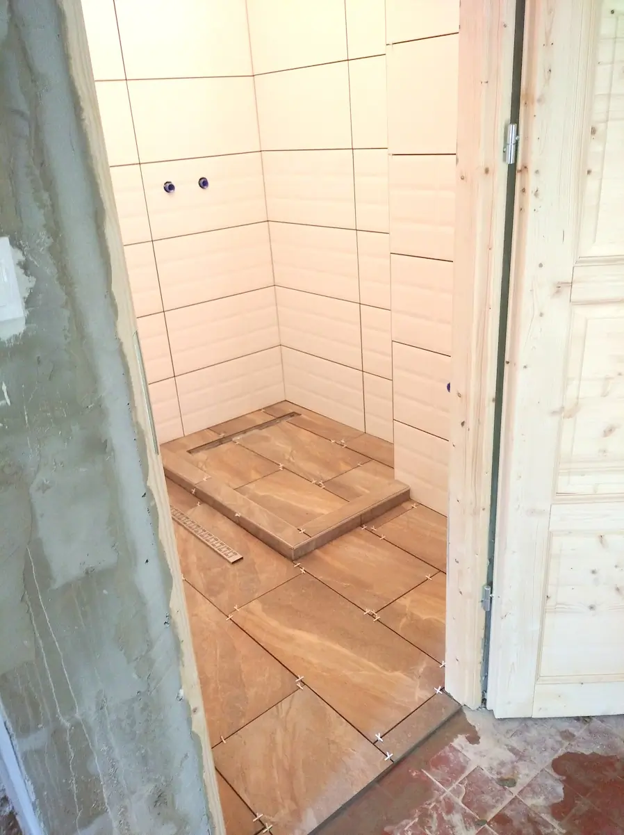 Fürdőszoba folyamatban lévő burkolása, épített zuhanytálcával