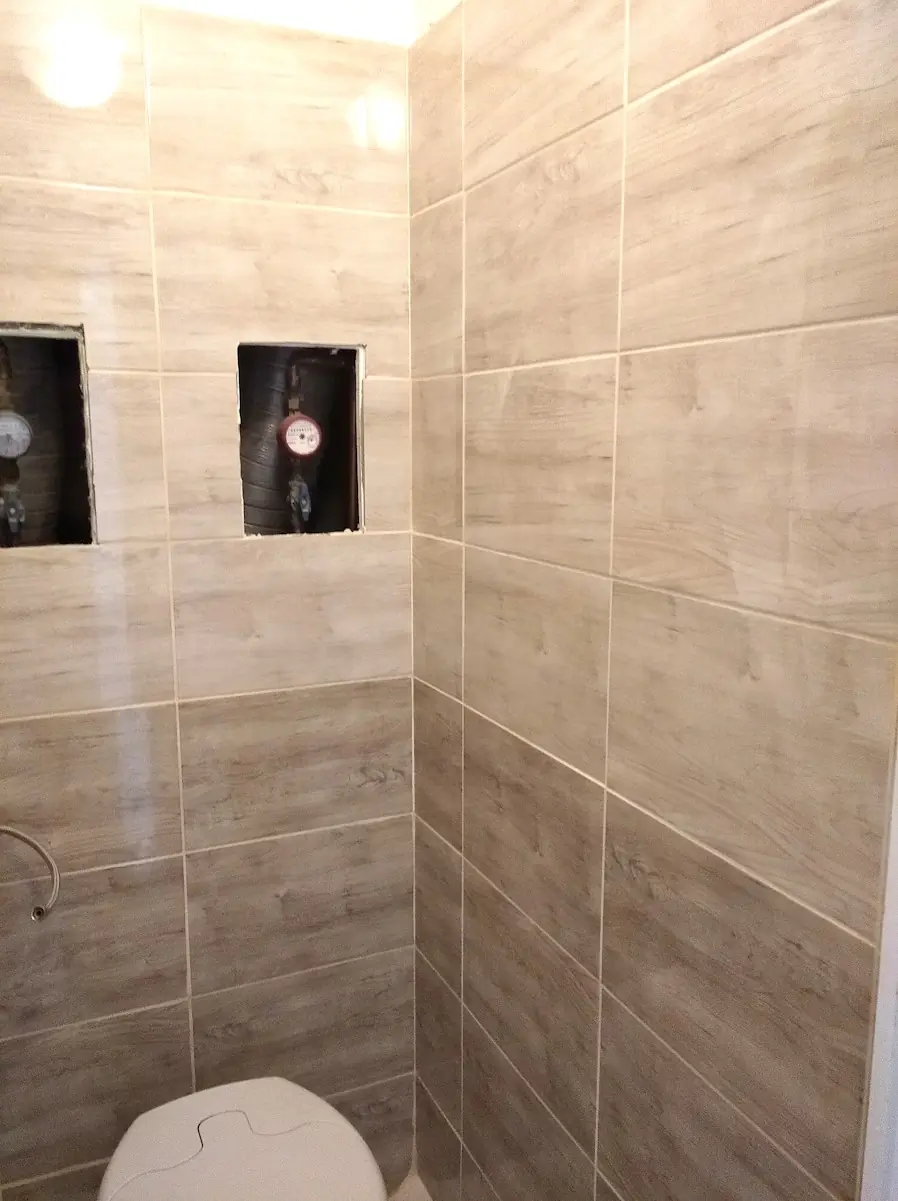 Panel WC burkolása, mérőóra szervizajtókkal.