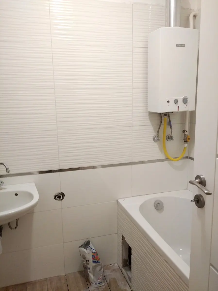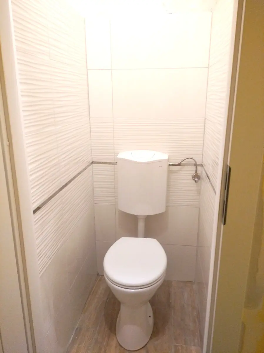 Fürdőszoba felújítása: új kád, WC, beépített mosdókagyló, oldalfal és járólap burkolás.