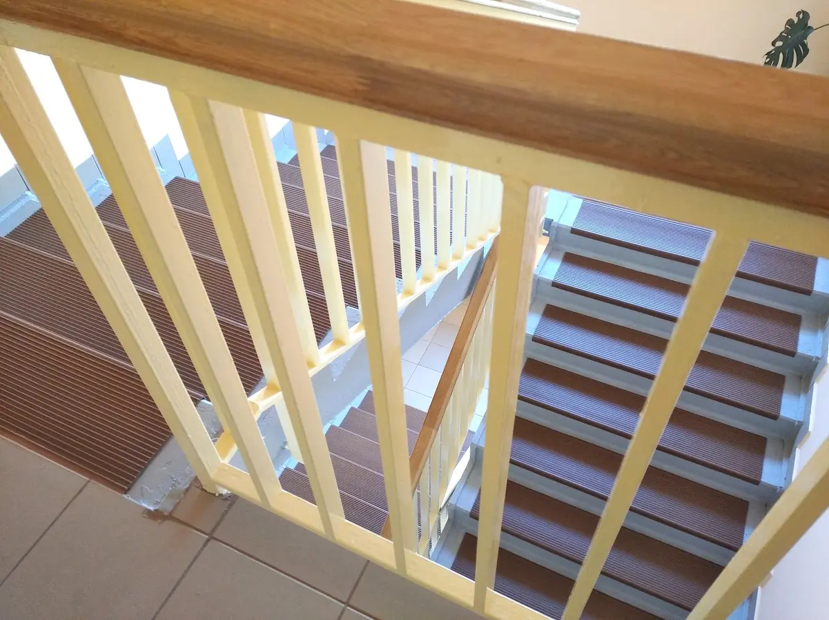 Lépcsőház felújítás: festés, mázolás, korlátok, aljzatburkolás, lépcső PVC burkolás.