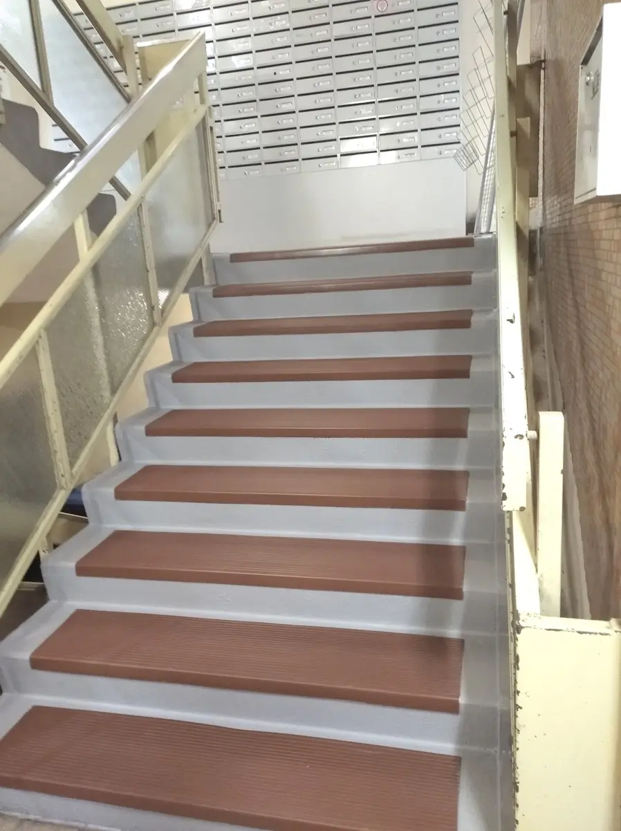 Panel lépcsőfelújítás: betonfestés, bordás PVC.